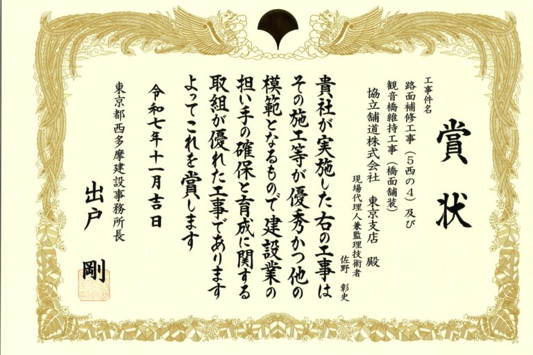 令和7年度 建設局優良工事表彰 ●路面補修工事(6三の1・遮熱性舗装) 『車道部遮熱性舗装を行うもので当社は切削オーバーレイ工法の施工を予定していましたが以前より沿道住民の方々から 振動に関する苦情が寄せられたことを受け…
