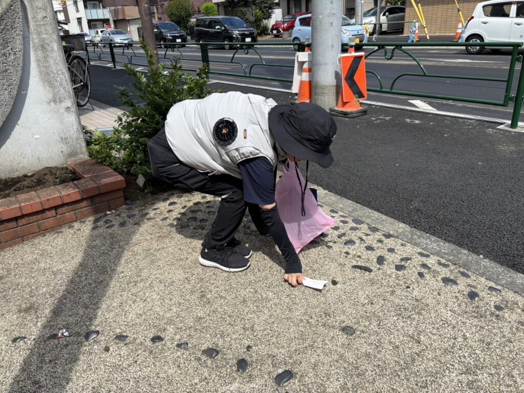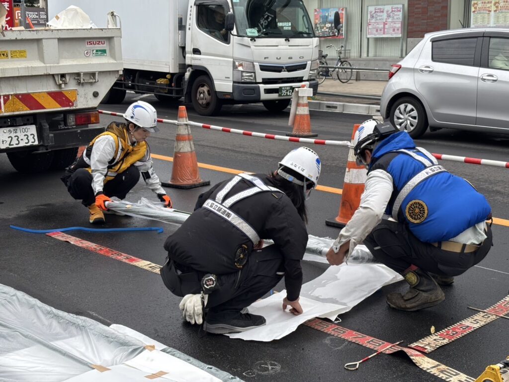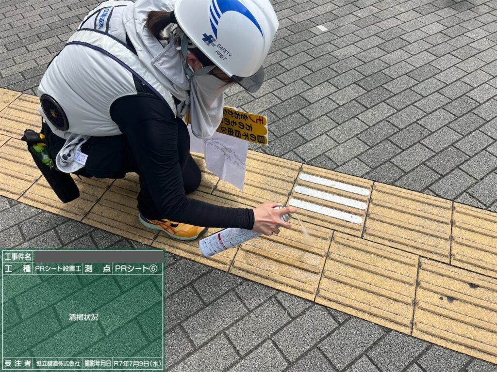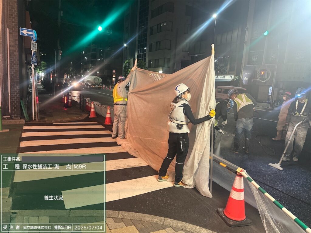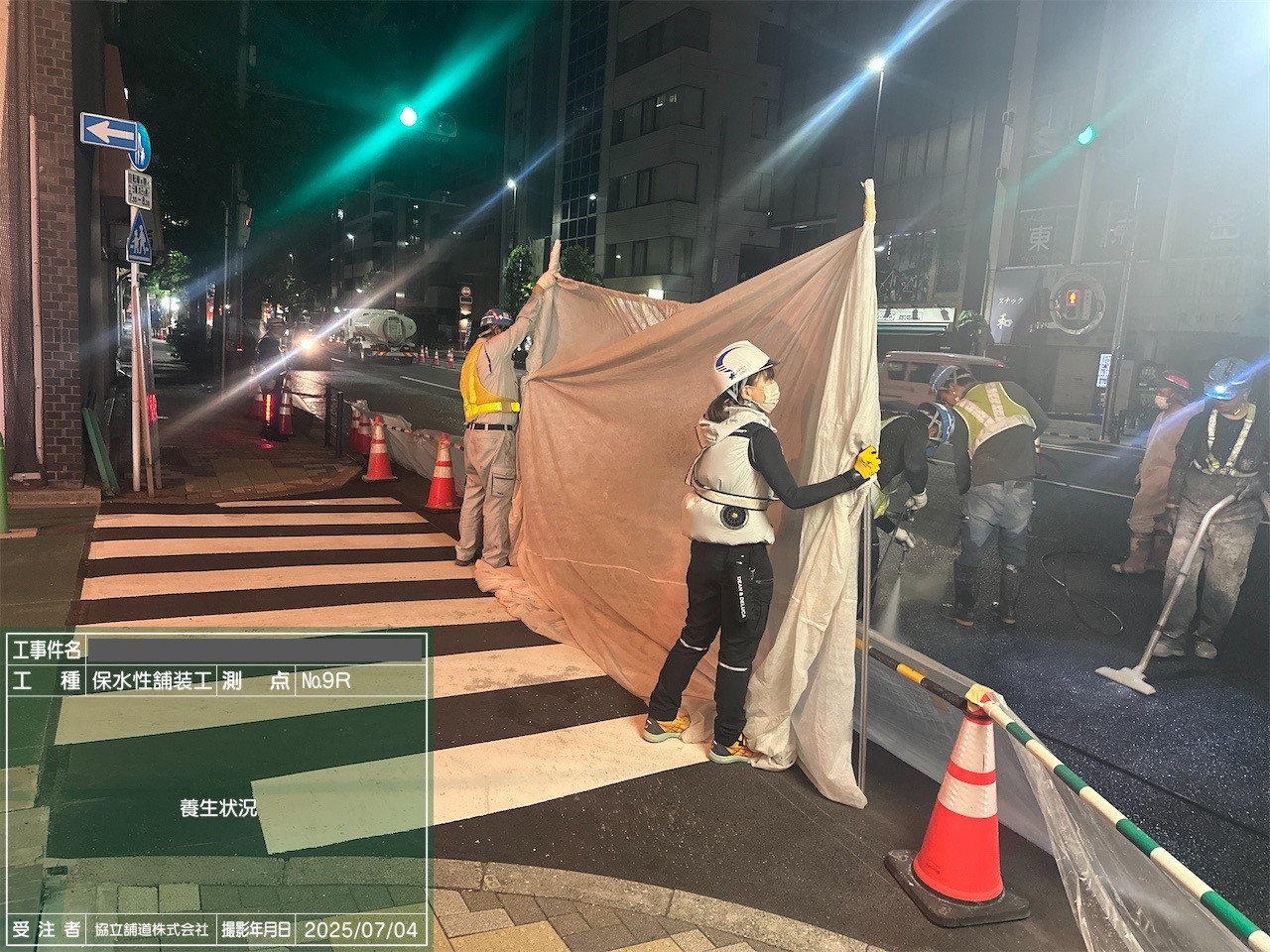 養生で歩道をカバーしながら、道路の保水性のスプレーを浴びます(笑)