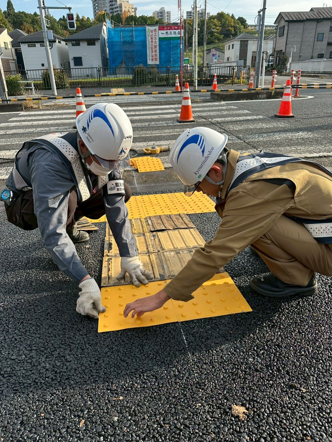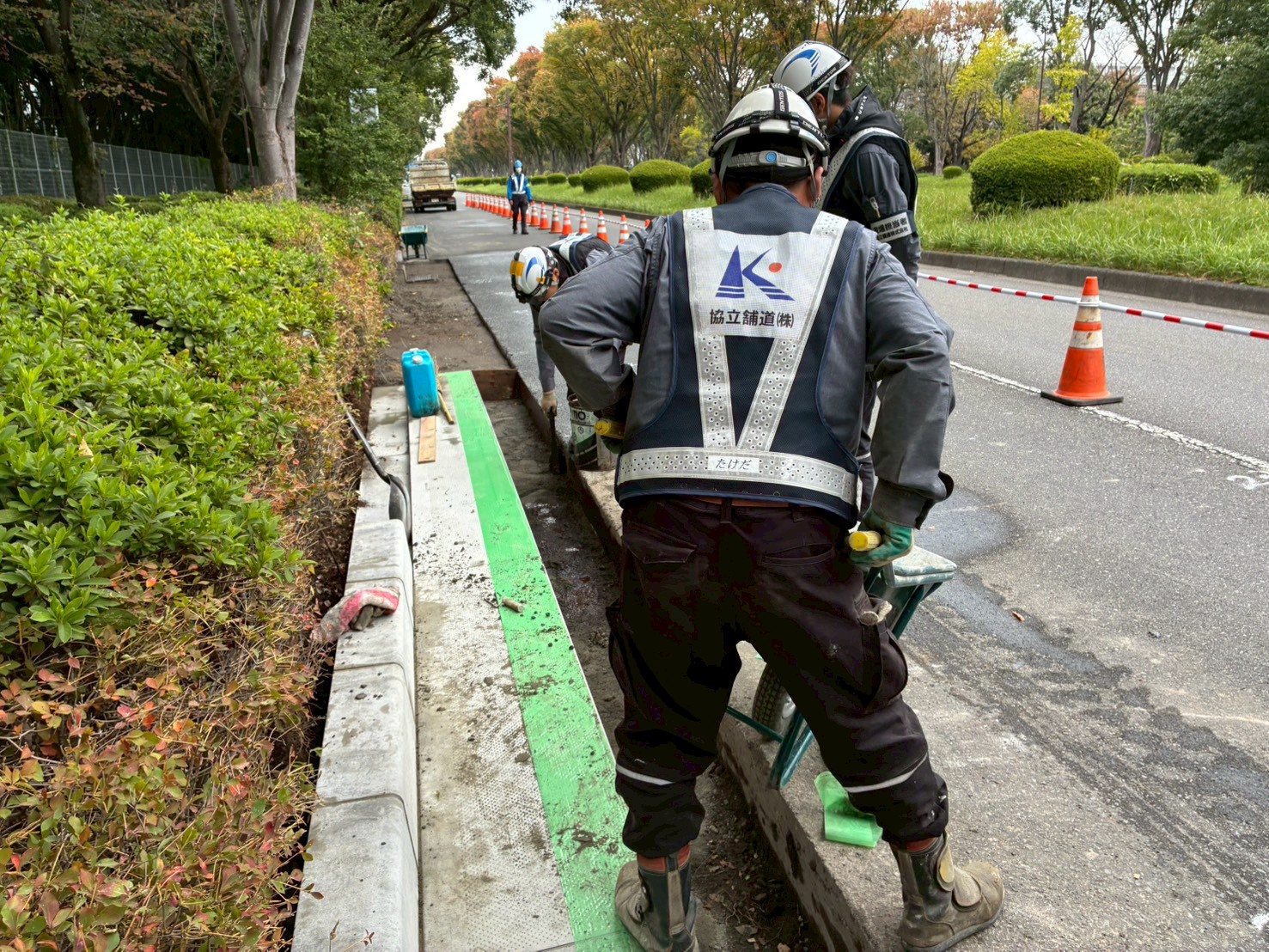 作業員の人たちの敷き均しの体験や、監督さんがやる点字シートを張る手伝いもしました