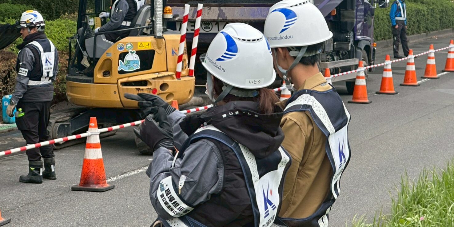 ここは立川の交通量の多いところで、真ん中の中央分離帯の上で現場を見学しています
